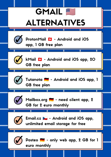 I have switched from Google’s Gmail to ProtonMail and kMail. I really like both, kMail (by Infomaniak) have very similar app interface to Gmail so you will get used to it very fast and also have big storage for free and very good offers for paid plans 👍🏼