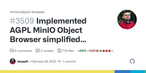 arrow-up10arrow-down1external-linkMinio strips away almost all features from AGPL interface and suggests people use their licensed "AIStor" service insteadgithub.comqaz@lemmy.world to Selfhosted@lemmy.worldEnglish · edit-25 months agomessage-square6linkfedilink